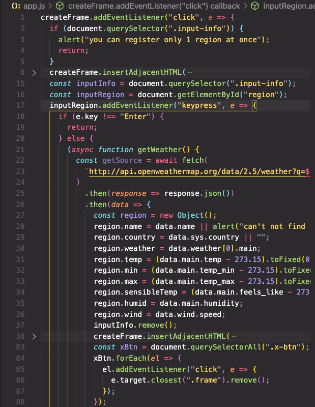 javascript의 경우 그동안 내가 부족했던 부분을 다시금 상기하는 시간이라 좋았다. 다만 비동기 부분은 아직도 많이 해매고 있는 중이다. 끝내 완성은 했지만 코드가 상당히 지저분한 편이다.(그 유명한 callback hell을 내가 하고있었다) api에게 요청한 데이터를 global 부분에서 불러내 나타내고 싶었지만 이 부분은 이후의 숙제로 남겨져 있는 상태이다.